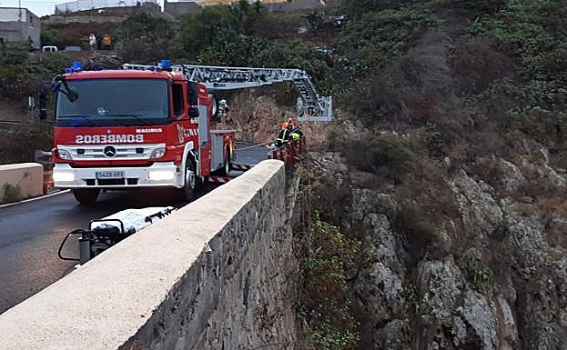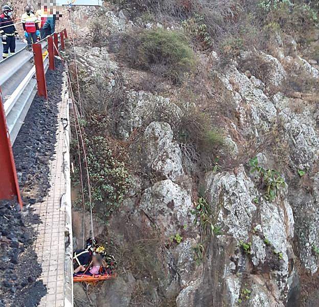 El ciclista fue izado desde una repisa del barranco de Polegre, a unos 15 metros de profundidad, con una autoescala sujeta a la camilla hasta un lugar seguro, donde fue atendido por profesionales del Servicio de Urgencias Canario.