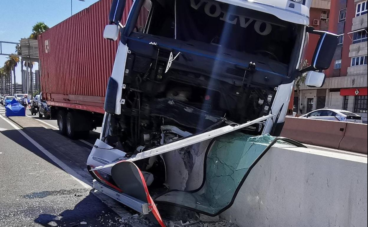 El camión accidentado impactó contra un muro, quedando destrozada la parte delantera del mismo. Dicho muro impidió que invadiera el sentido contrario y se produjeran males mayores.