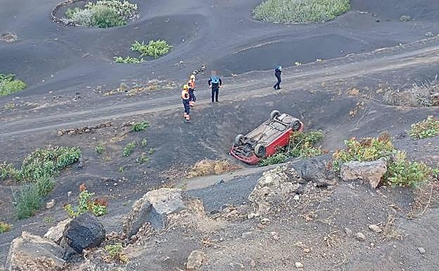 Un vehículo cayó en un hoyo este domingo por la tarde en el municipio de Yaiza, Lanzarote, cuando circulaba en dirección Montaña Diama. El automóvil terminó volcando, quedando con las ruedas mirando al cielo.