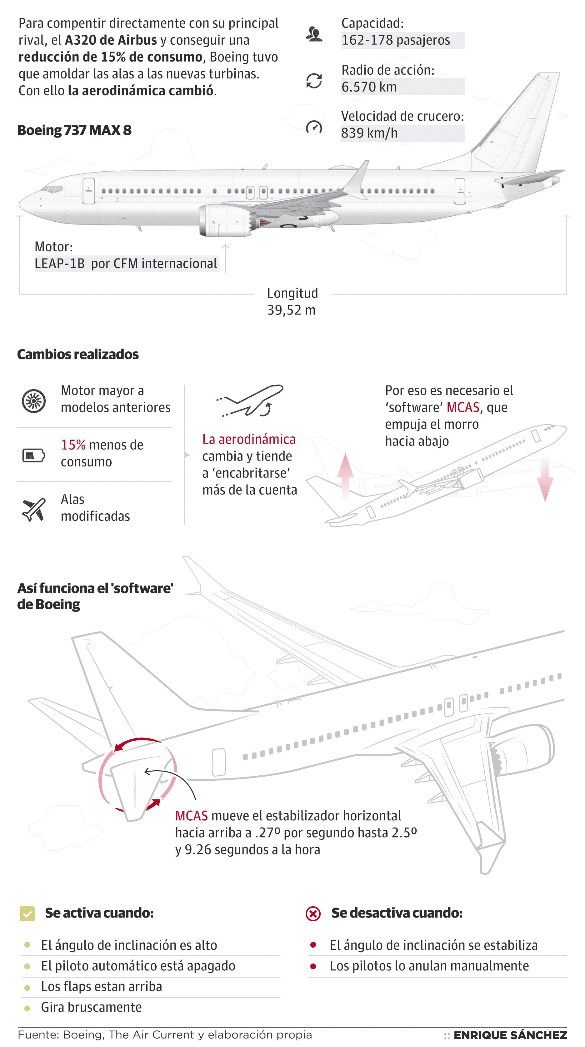 El objetivo era ganar en las variables económicas para rivalizar con los Neo. Su diseño incluye como gran novedad unos motores nuevos, notablemente más grandes, que deben ser colocados más adelante para evitar que choquen contra el suelo. Eso provoca que el avión tenga tendencia a subir el morro y, por lo tanto, Boeing introdujo un sistema de 'software' automático -llamado MCAS- que compensaba esa inercia automáticamente. Así, un piloto de cualquier 737 podría volar un MAX con una formación mínima.