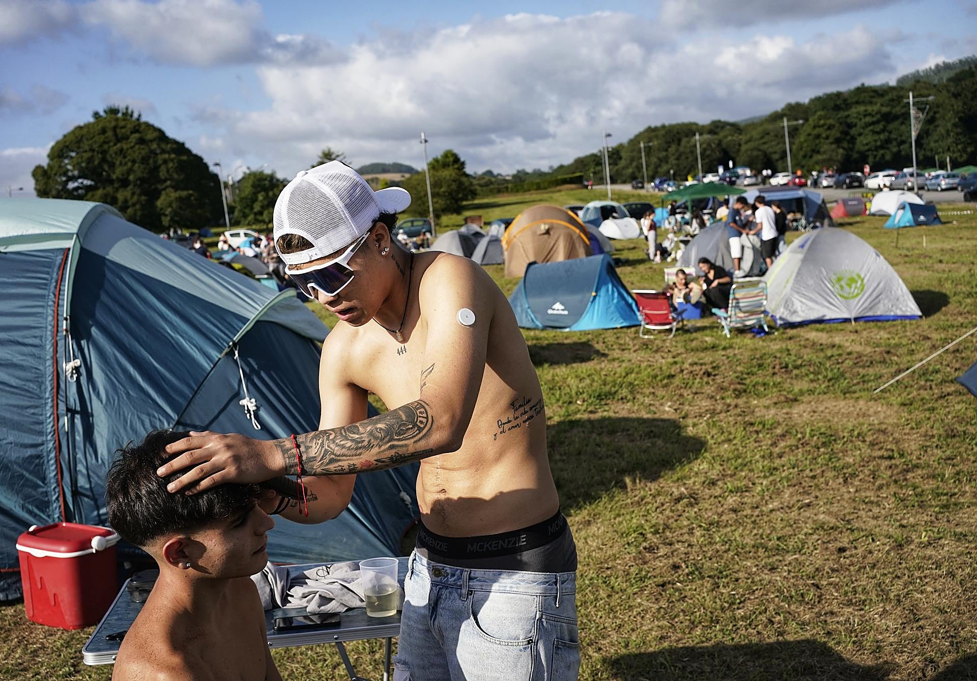 Ahora las reparten en varias jornadas, y en el camping reina un ambiente de bulliciosa chavalería: «Son tres días de fiesta, está de putísima madre –resume Osvaldo Herrera, de Ferrol, que le hace a un colega un moderno rapado con su raya en la ceja–. Hay de todo, ¡hasta estoy yo cortando el pelo!». Alberto Seoane y Marcelo Silva venden boletos de un equipo de fútbol sala: «Donde va la Panorama, vamos nosotros. Cien veces los habré visto», comenta Alberto. «Y yo 101», se chulea Marcelo. Pero las historias más bonitas hay que buscarlas delante del escenario, como la del guipuzcoano Álvaro Gómez, de Andoain: «Me quedé viudo hace once años y mi salvación, con aquella pena que sentía, fueron los espectáculos. Miré cuáles eran las mejores orquestas de España, Panorama y París de Noia, y consulté dónde actuaban juntas, ¡en As Somozas! Llevo diez años viniendo y también he visto a Panorama en Valencia, en Asturias, en Cantabria, en Bizkaia...», enumera. Con unos amigos, trae una txapela bordada para uno de los cantantes, Mario Álvarez, que ganó 'OT' en 2009. Otro caso: Joan Vila es de Platja d'Aro, en Girona. «En verano, me escapo del calor y vengo en autocaravana al Cantábrico. El año pasado los vi aquí».