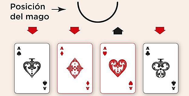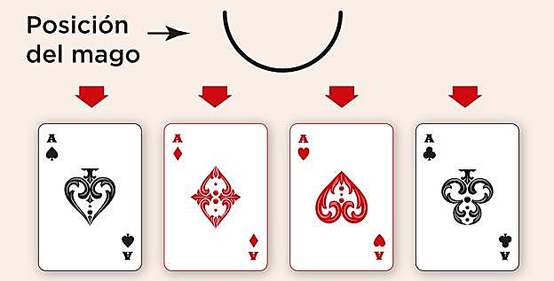 A continuación, las iremos sacando de la caja una a una y las colocaremos boca arriba en el tapete. La carta que aparezca con una orientación diferente a las otras será la del espectador. Por ejemplo, en la imagen es el as de corazones. Si todas las cartas muestran la misma orientación, la del espectador será el as de rombos.