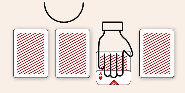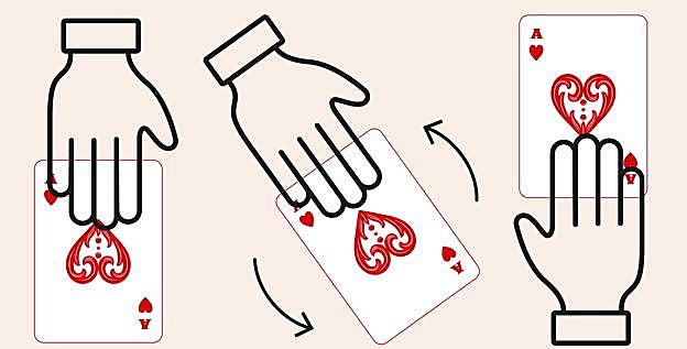 Aquí radica el truco. Cuando le enseñemos la carta al espectador, giraremos la muñeca 180 grados para mostrarla dada la vuelta, con el fin de colocarla ya girada en el tapete. De esta forma, tres cartas estarán al derecho, según las hemos colocado inicialmente; y la del espectador, al revés.