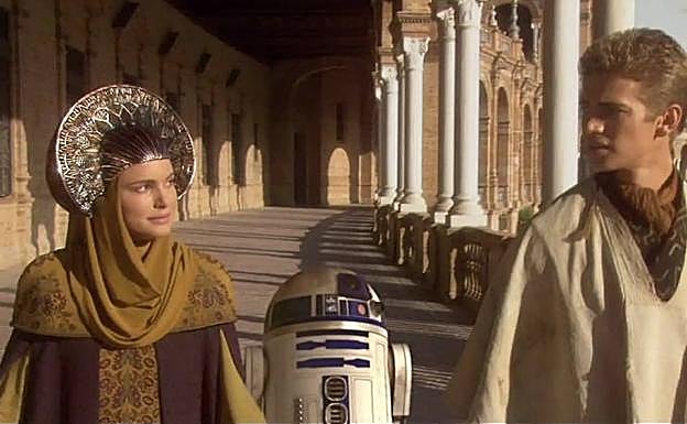La turística Plaza de España, en Sevilla, sirvió en el año 2000 como escenario para acoger el planeta Naboo, donde reside la reina Padmé Amidala. Solo 48 horas de rodaje sirvieron para poner la capital hispalense patas arriba y convertir la ciudad en lugar de peregrinaje de los fans de la saga galáctica. Una escena mostraba a una nave aterrizando en medio de la plaza, y a continuación, Amidala y Anakin aparecen conversando tranquilamente mientras pasean, seguidos de cerca por R2D2.