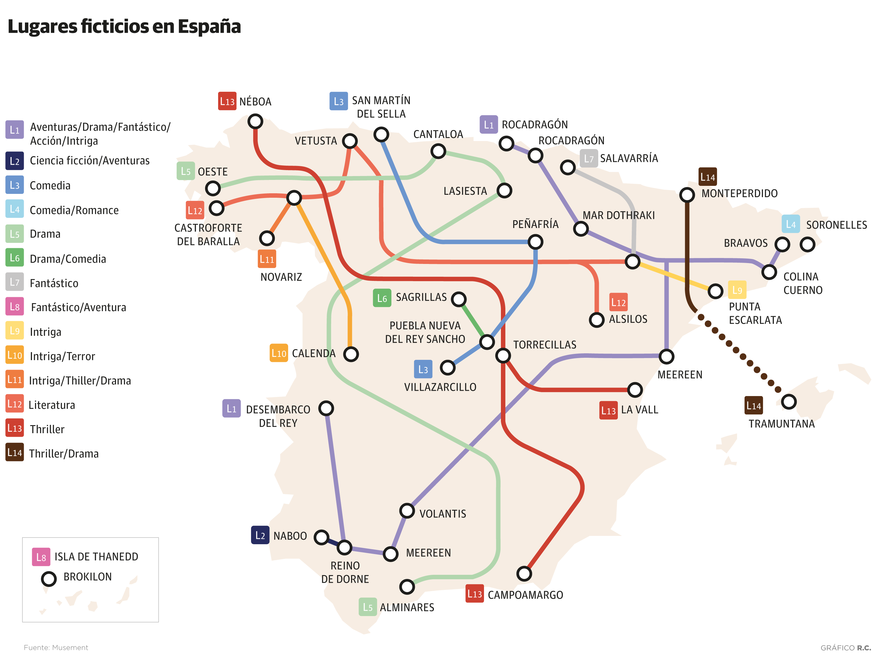 Pero España está llena de destinos que nos conducen a experiencias vividas antes gracias a nuestras incursiones en la ficción, ya sea en libros, series o películas. Y buena parte de ellas han quedado retratadas en un mapa elaborado por la plataforma de reserva de viajes y otro tipo de experiencias Musement, donde proponen «un recorrido único a través de lugares ficticios que, en realidad, sí existen». Para ello, han localizado en una infografía más de 30 escenarios imaginarios en nuestro país. «De norte a sur y de este a oeste, el mapa descubre los paisajes reales en los que se han recreado o inspirado estos pueblos y ciudades ficticias», prometen.