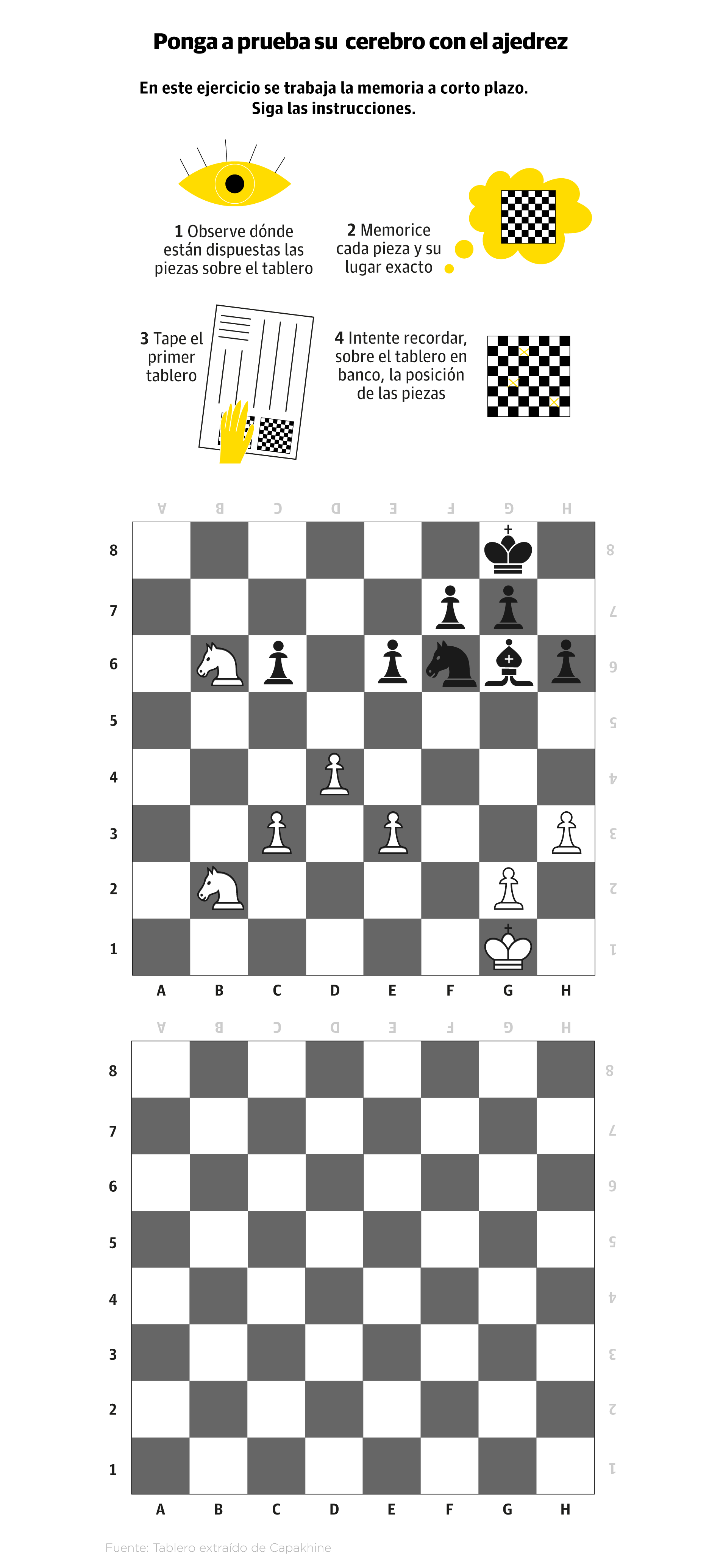 Si lo que quieren es fomentar la memoria de trabajo, es decir, la que manipula la información que se memoriza, lo hacen de esta otra forma. Colocan 3 o 4 piezas en el mural, dejan que los participantes memoricen su posición durante un minuto, las retiran y les hacen preguntas. ¿Cuántas piezas había? ¿De qué color eran? ¿Había alguna que no se había movido de su posición inicial? ¿Si alguna de ellas se mueve puede dar jaque a rey negro? Por ejemplo, si un peón está en la segunda o la séptima fila es que no se ha movido, porque esa es su posición inicial en una partida de ajedrez tradicional, y si tiene enfrente al rey, le podrá hacer jaque. «Aunque se practique en grupo, el trabajo es individual, porque cada persona hace sus cálculos de forma independiente», cuenta el presidente del club.