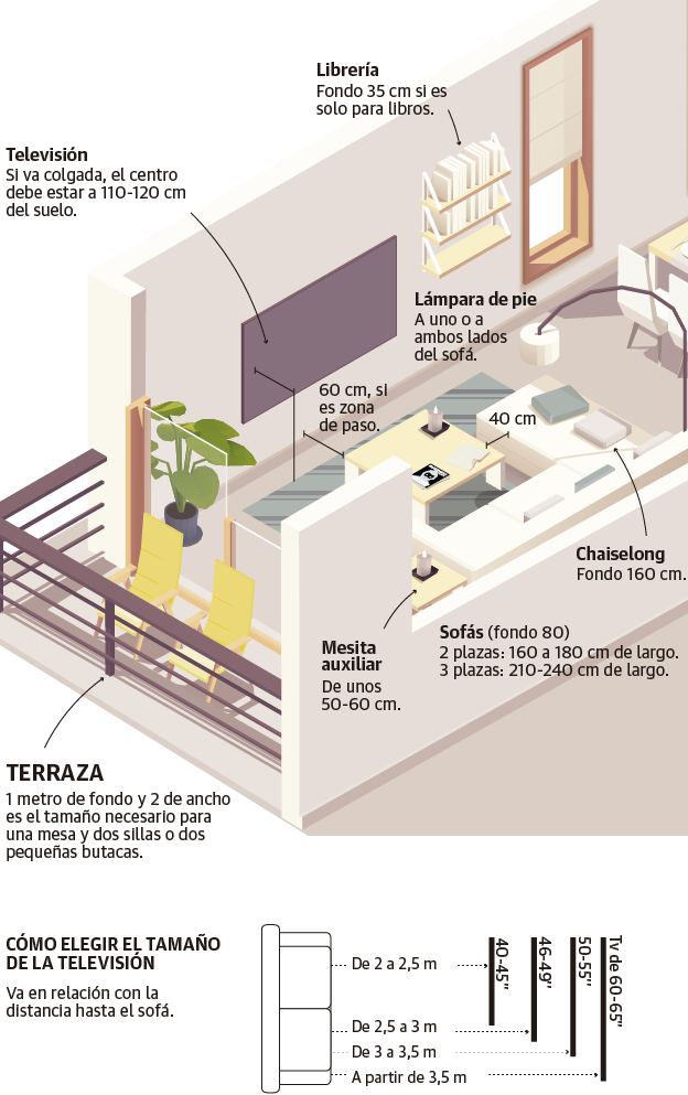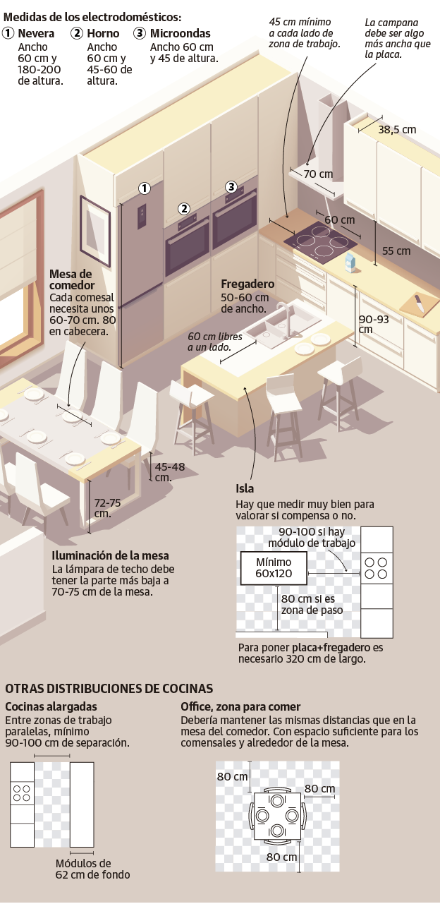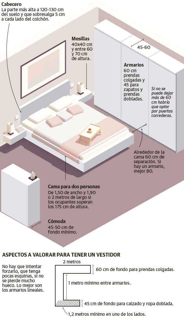 La correcta distribución tanto de los espacios como del propio mobiliario es una de las claves para lograr que una vivienda 'funcione', que sea realmente cómoda para las personas que viven en ella. «A veces más incluso que el propio tamaño», admite la interiorista Natalia Zubizarreta. Empeñarse en poner un vestidor en un hueco de tres metros cuadrados o colocar una isla en una cocina demasiado pequeña no tiene sentido. «Hay unas medidas mínimas que se deben respetar para que la casa sea práctica. De nada sirve tener un baño o una habitación preciosa si te no puedes dar una ducha cómodamente o cada vez que entras en el dormitorio te chocas con la cama», argumenta la experta. Estas son sus propuestas.